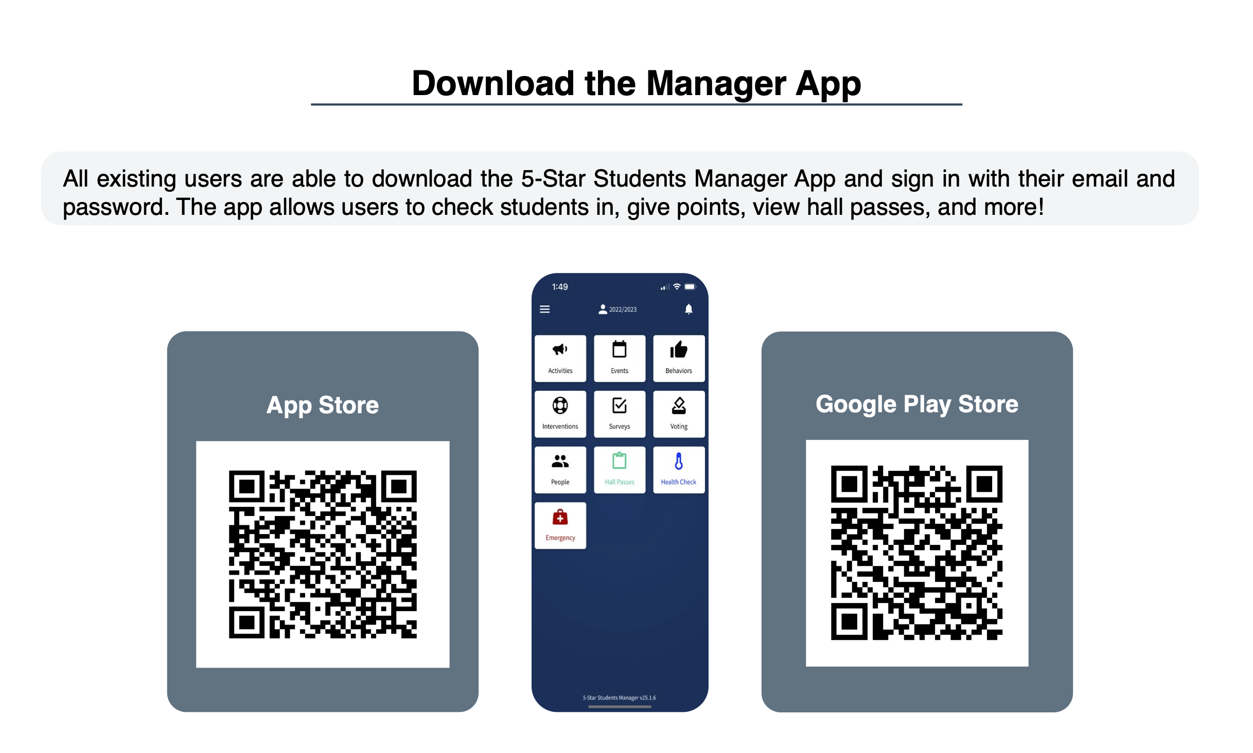 Download the 5-Star Students Manager App to give points, check-in, and view hall passes on the go.